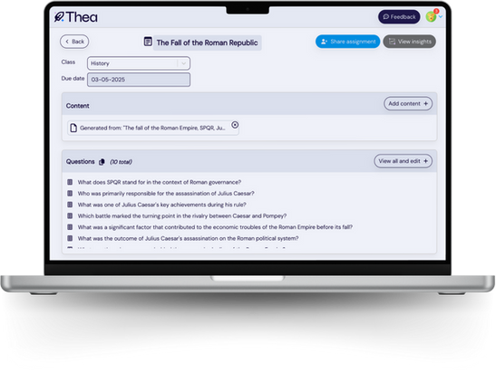 Save time and streamline your workload with Assignment Mode—designed to make creating and grading assignments effortless. Simply describe the material or upload your content, and Thea instantly generates questions. Review, accept, remove, or generate more until it’s just right. Once students complete their assignments, Thea handles the grading.