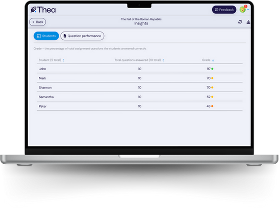 Thea makes it easy to track individual and class progress in real time, helping teachers quickly spot areas where students excel or need extra support.